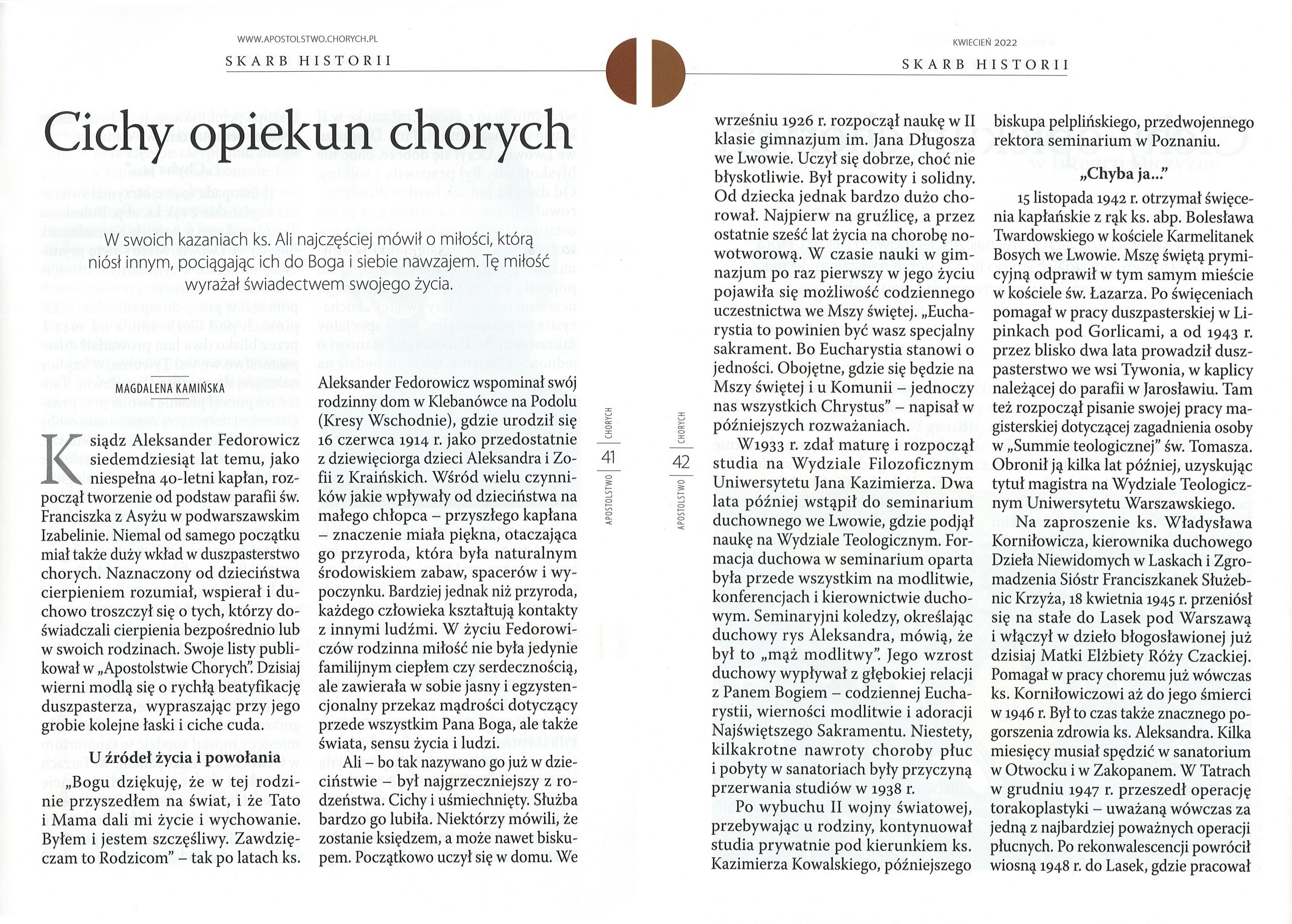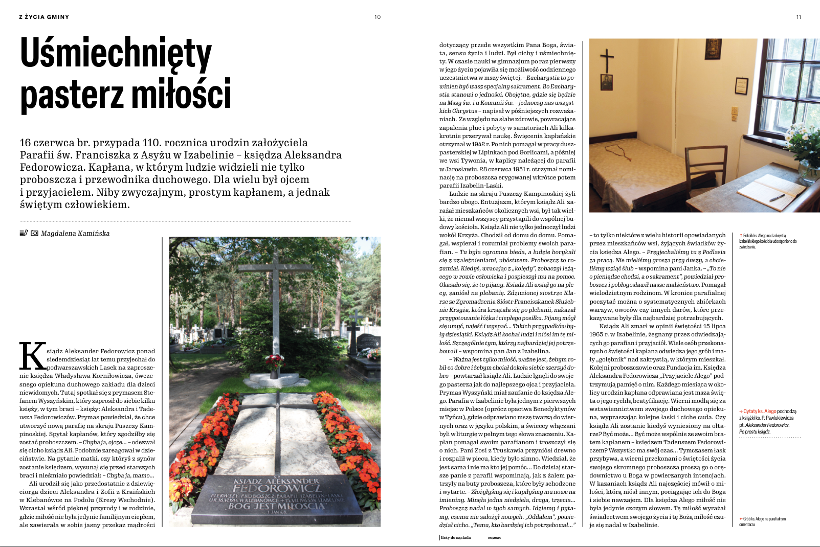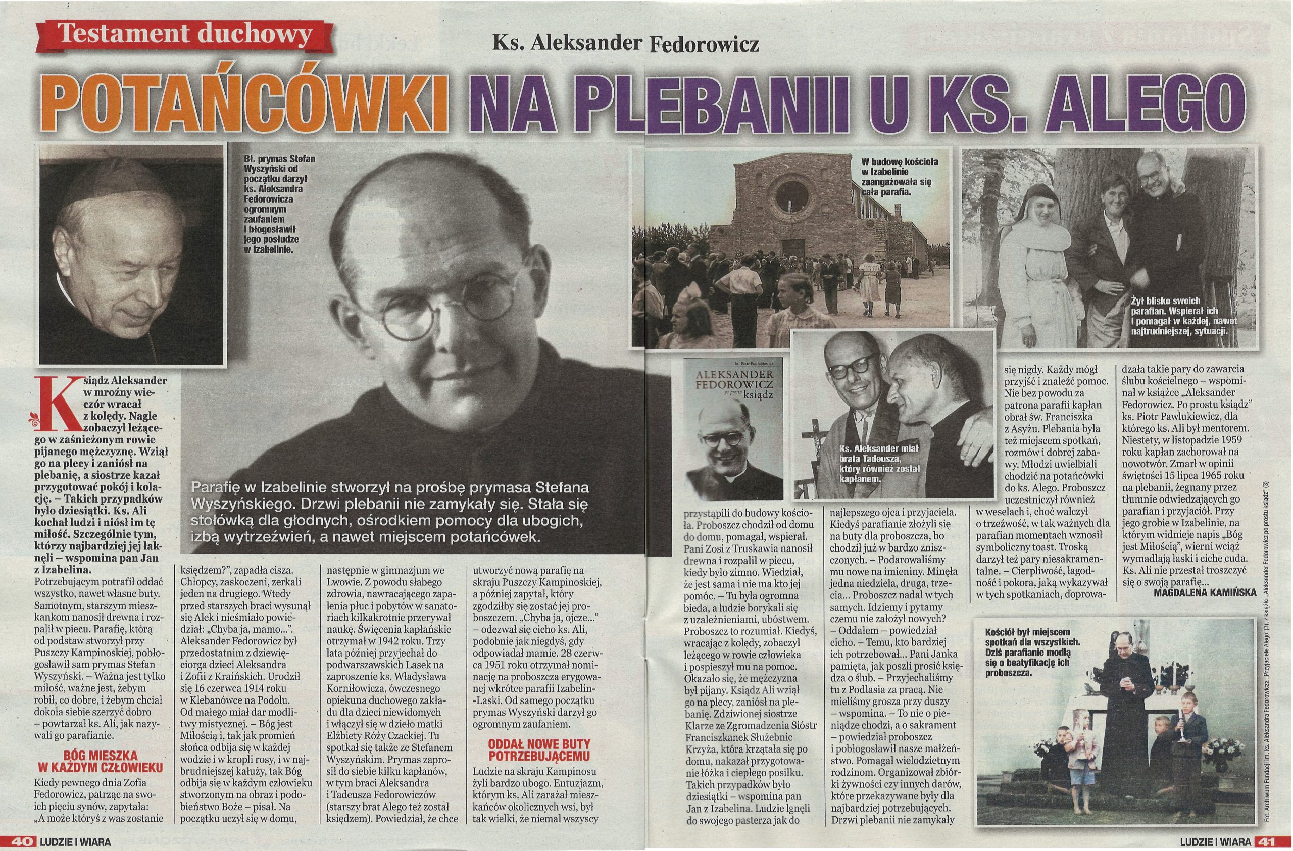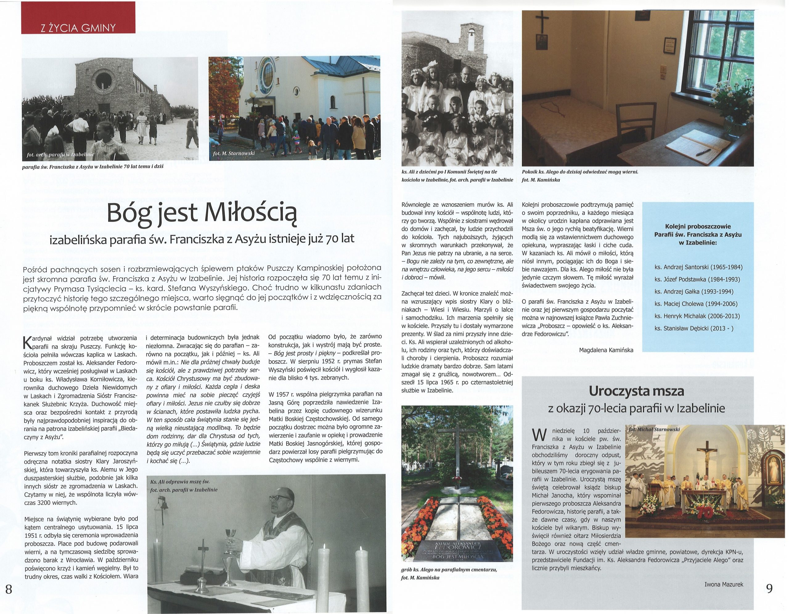(…) Jesteśmy posłani, to jakiś urząd w Kościele, to misja, musimy rozwinąć w pełni chrześcijaństwo w sobie i w ludziach. Przez Eucharystię – miłość w jedności z Chrystusem i z ludźmi – wszędzie. Nie może być dla nas obcych ludzi. Mamy być braćmi wszystkich: i tych, co dalecy od Boga i tych, co są bliscy. Być otwartym na każdego człowieka. A wszystko dla chwały Bożej! – mówił pierwszy proboszcz i budowniczy Parafii św. Franciszka z Asyżu w Izabelinie ks. Aleksander Fedorowicz.