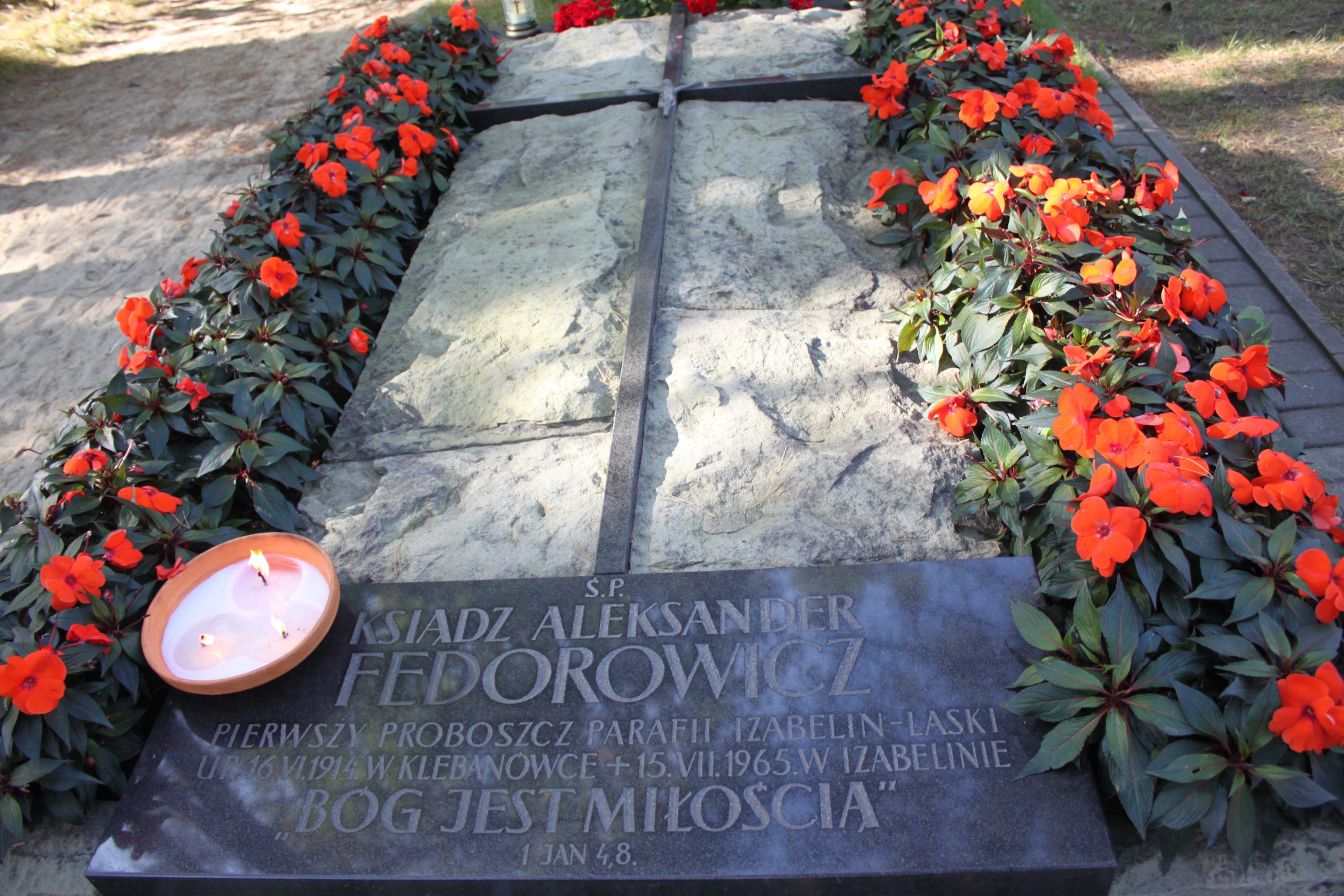 Miejscowy cmentarz usytuowany jest bezpośrednio przy terenie Parafii św. Franciszka z Asyżu w Izabelinie. Można do niego dojść ul. Ks. Aleksandra Fedorowicza oraz boczną drogą, terenem parafialnym. Pierwszy proboszcz Parafii św. Franciszka z Asyżu zmarł w opinii świętości we czwartek, 15 lipca 1965 r. żegnany przez tłumnie odwiedzających go do samego końca wiernych. Pochowany został na izabelińskim cmentarzu w sobotę 17 lipca. Pomimo ulewnego deszczu wierni tłumnie przyszli odprowadzić do grobu ciało ukochanego Ojca. Zgodnie z Jego wolą – na grobie wyryty został cytat z Ewangelii św. Jana „Bóg jest Miłością”. Kolejni proboszczowie dbają o grób ks. Alego. Przychodzą też wierni, którzy coraz liczniej wypraszają łaski u Pana Boga za wstawiennictwem uśmiechniętego ks. Alego.